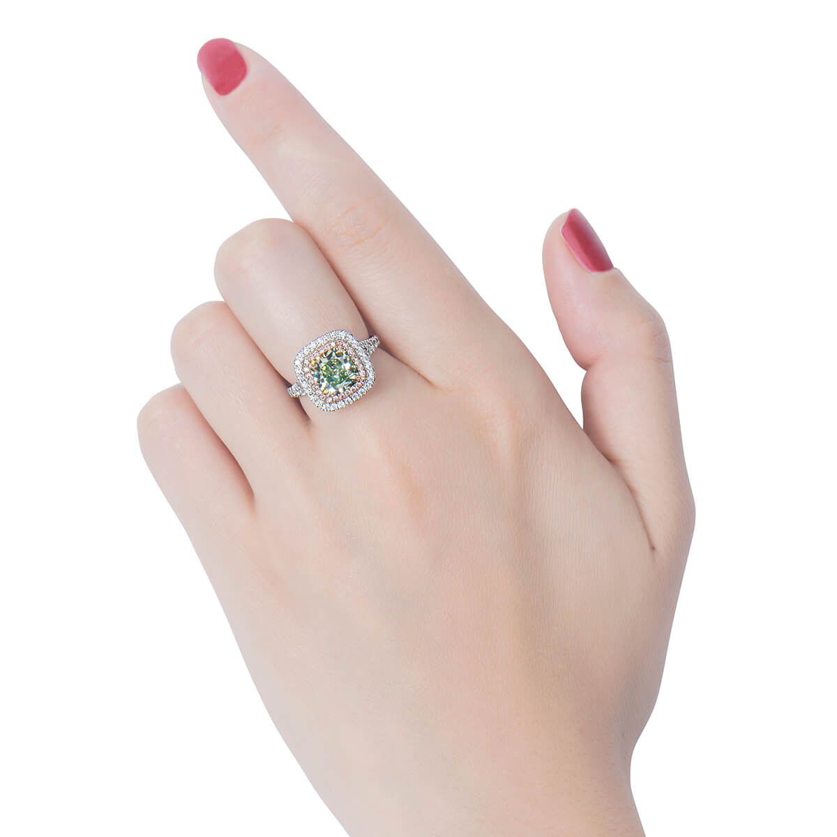 Piękny i niespotykany kolor głównego diamentu nadaje temu pierścionkowi niepowtarzalny look.